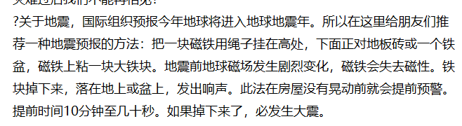 看到这儿,你明白了吗?这个全新版本的谣言也有改进的地方,添加了磁铁警示地震的方法,但是!这也是不靠谱的!